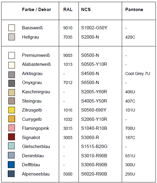 Sonderfarben, Dekore, z.B. in Holzoptik, Keramik-Beschichtungen und Strukturen gegen Mehrpreis